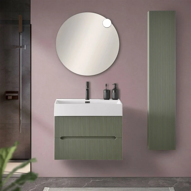 Fedele al valore del Made in Italy,il mobile Bali è realizzato in legno MDF,materiale ecologico e di ottime performance,con finitura verde opaco. La base del mobile ospita un lavabo in resina bianco lucido di alta qualità,per una composizione bagno che include anche lo specchio tondo a filo lucido.