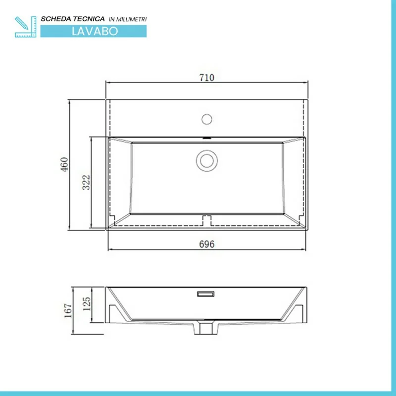 • Dimensioni lavabo:L 71 x p 46 x H 16,7 cm;profondità pozzetto 32 cm;