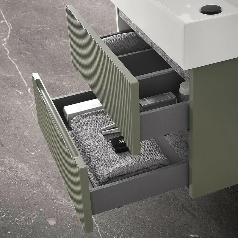 • 2 cassetti con alloggio salva-sifone,chiusura soft-close e apertura a gola;