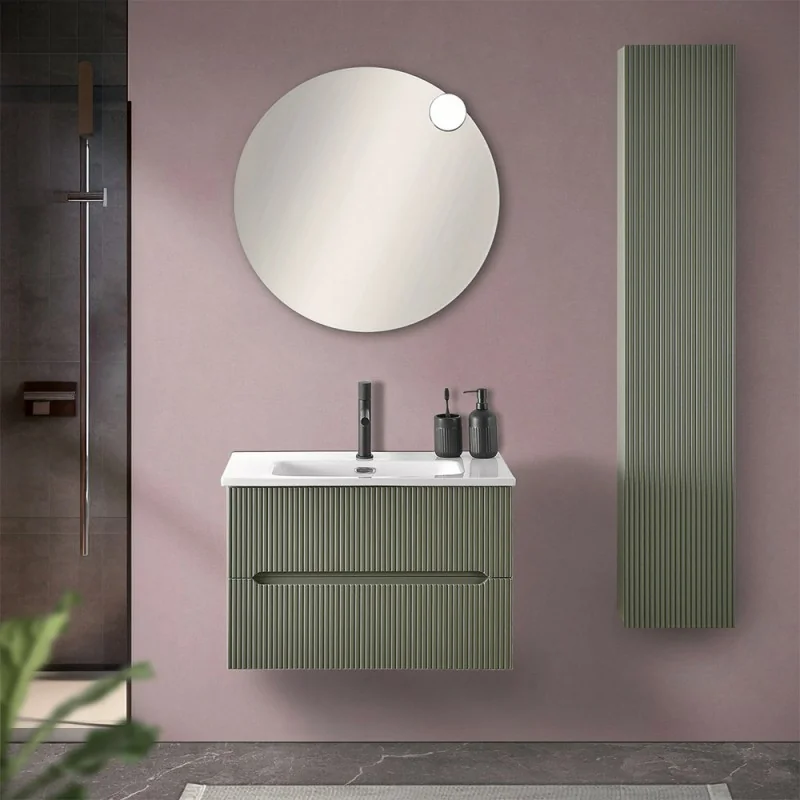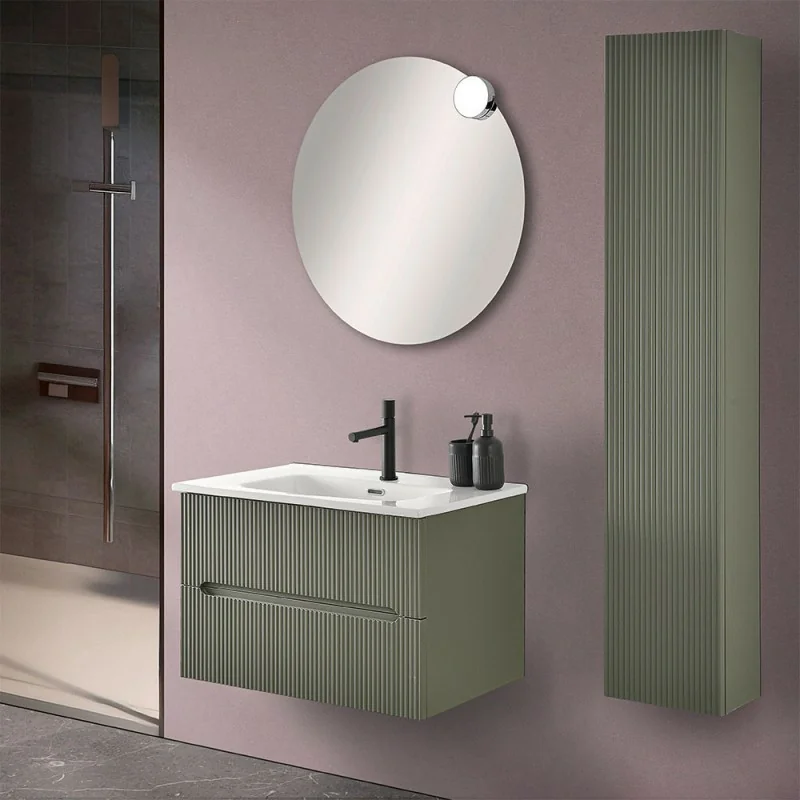 Fedele al valore del Made in Italy,il mobile Bali è realizzato in legno MDF,materiale ecologico e di ottime performance,con finitura verde opaco. La base del mobile ospita un lavabo in ceramica bianco lucido di alta qualità,per una composizione bagno che include anche lo specchio tondo a filo lucido.
