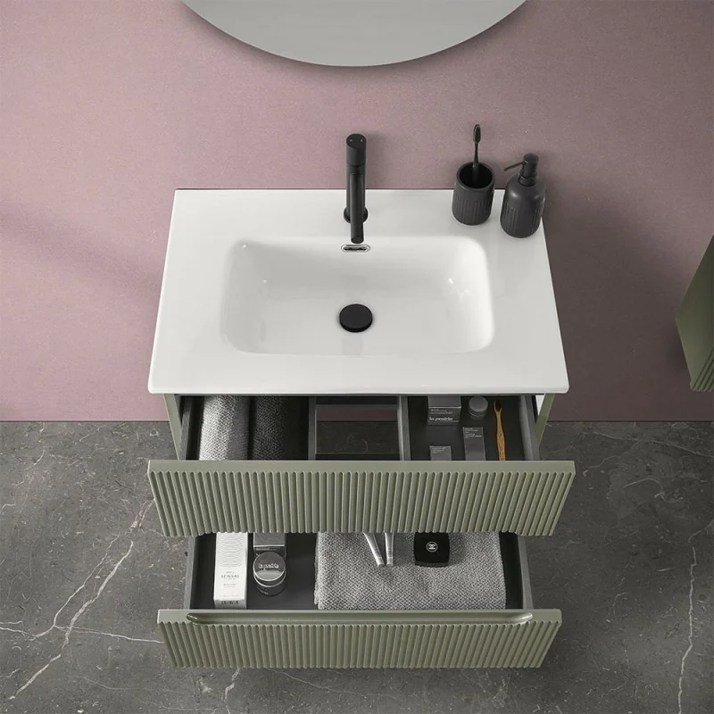 Il mobile è dotato di due cassetti con chiusura soft-close,apertura a gola e alloggio salva sifone. È disponibile di diverse misure e finiture,anche con lavabo in resina o con top e lavabo d’appoggio e pensile abbinato.