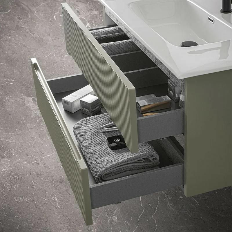 • 2 cassetti con alloggio salva-sifone,chiusura soft-close e apertura a gola;
