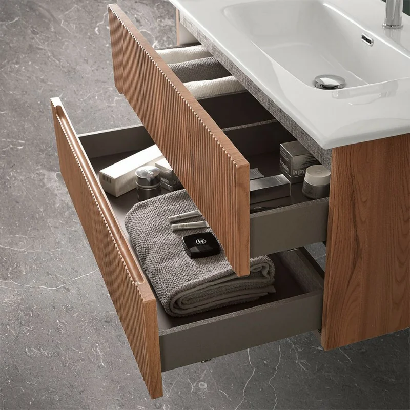 Il mobile è dotato di due cassetti con chiusura soft-close,apertura a gola e alloggio salva sifone. È disponibile di diverse misure e finiture,anche con lavabo in resina o con top e lavabo d’appoggio e pensile abbinato.