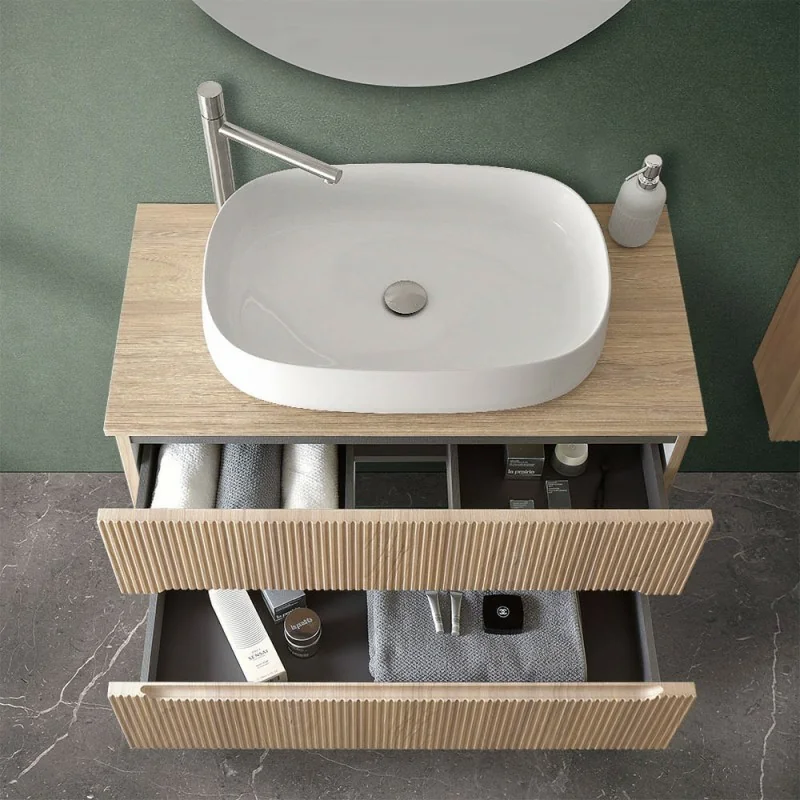 Mobile bagno sospeso 2 cassetti soft-close,top d’appoggio rovere chiaro e specchio a filo 80 cm
