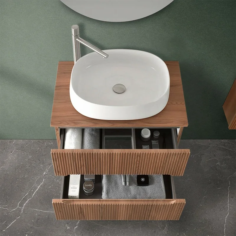 Mobile bagno sospeso – 2 cassetti soft-close,top d’appoggio noce e specchio a filo 70 cm