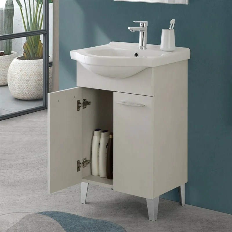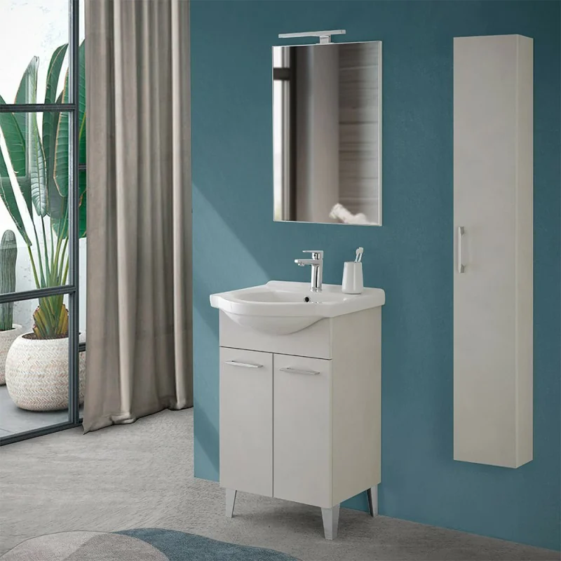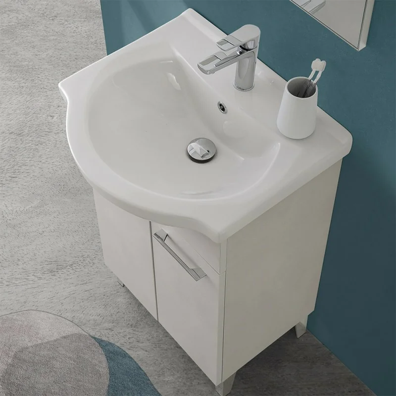 Il mobile bagno dispone di due ante con chiusura rallentata soft-close e apertura tramite maniglie realizzate in ABS cromato;la composizione poggia su piedini cromati,include il lavabo in ceramica completo di foro troppopieno e foro miscelatore,e la specchiera su cornice in PVC.