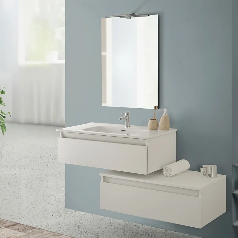 Versatile ed essenziale,il mobile dispone di una base portalavabo e un cassettone da posizionare liberamente sfalsato o allineato, per una composizione finale del tutto personale. I cassetti hanno pratica apertura a gola e chiusura rallentata soft-close;è inclusa la specchiera a filo con installazione reversibile.