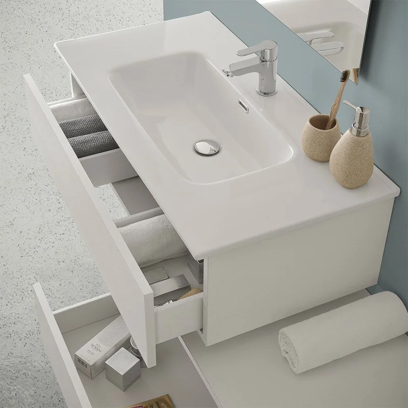 Versatile ed essenziale,il mobile dispone di una base portalavabo e un cassettone da posizionare liberamente sfalsato o allineato, per una composizione finale del tutto personale. I cassetti hanno pratica apertura a gola e chiusura rallentata soft-close;è inclusa la specchiera a filo con installazione reversibile.