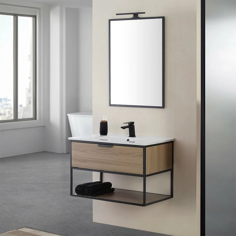 L'arredo include una struttura monoblocco in metallo nero con pratico cassetto in legno e vano al giorno inferiore,comodo piano d'appoggio per accessori e prodotti da bagno. La base ospita un lavabo da incasso in ceramica lucida e si completa di specchiera su telaio nero opaco con installazione reversibile .