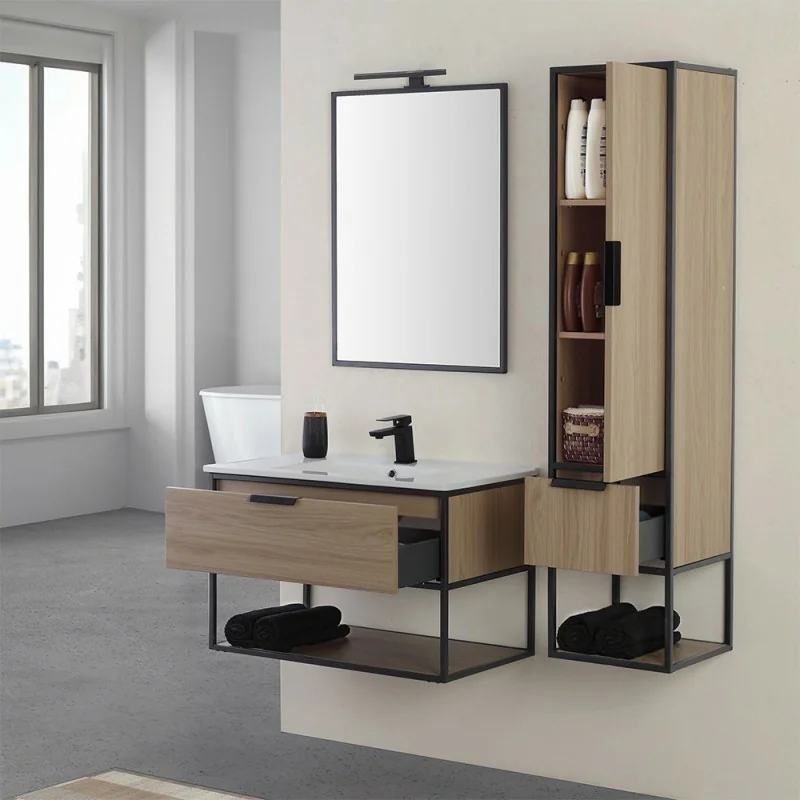 Mobile bagno sospeso 80 cm stile industrial nero e legno Baketo