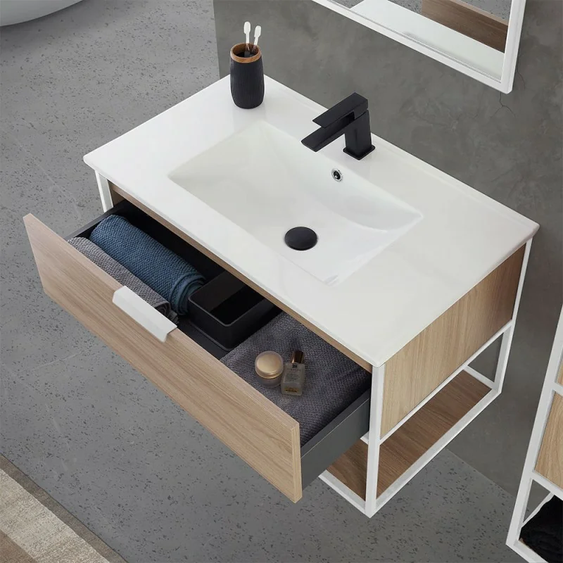 L’arredo include una struttura monoblocco in metallo biancocon pratico cassetto in legno e vano a giorno inferiore. La base ospita un lavabo da incasso in ceramica lucida e si completa di specchiera su telaio bianco con installazione reversibile e pensile abbinato con ripiani regolabili,cassetto soft-close e vano a giorno.