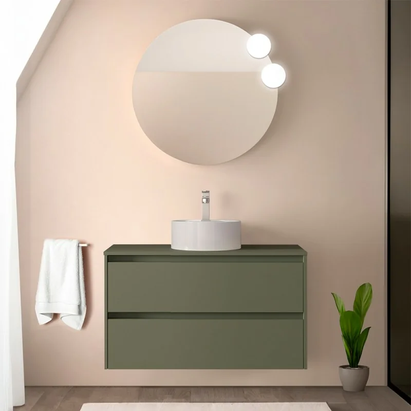 Mobile con top per lavabo d’appoggio,2 cassetti soft-close e specchio tondo a filo 80 cm