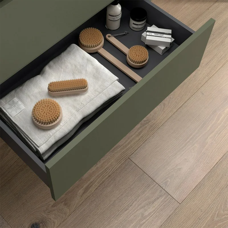 I cassetti del mobile dispongono di innovativo sistema Hettich,guide in metallo a scomparsa che assicurano una chiusura soft-close silenziosa e un allineamento preciso e senza sforzo. L’armonia della composizione bagno è completata dal top per lavabo d’appoggio e specchio a filo lucido con applique LED da acquistare separatamente.