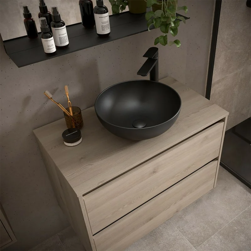 Mobile con top per lavabo d’appoggio,2 cassetti soft-close e specchio tondo a filo 60 cm