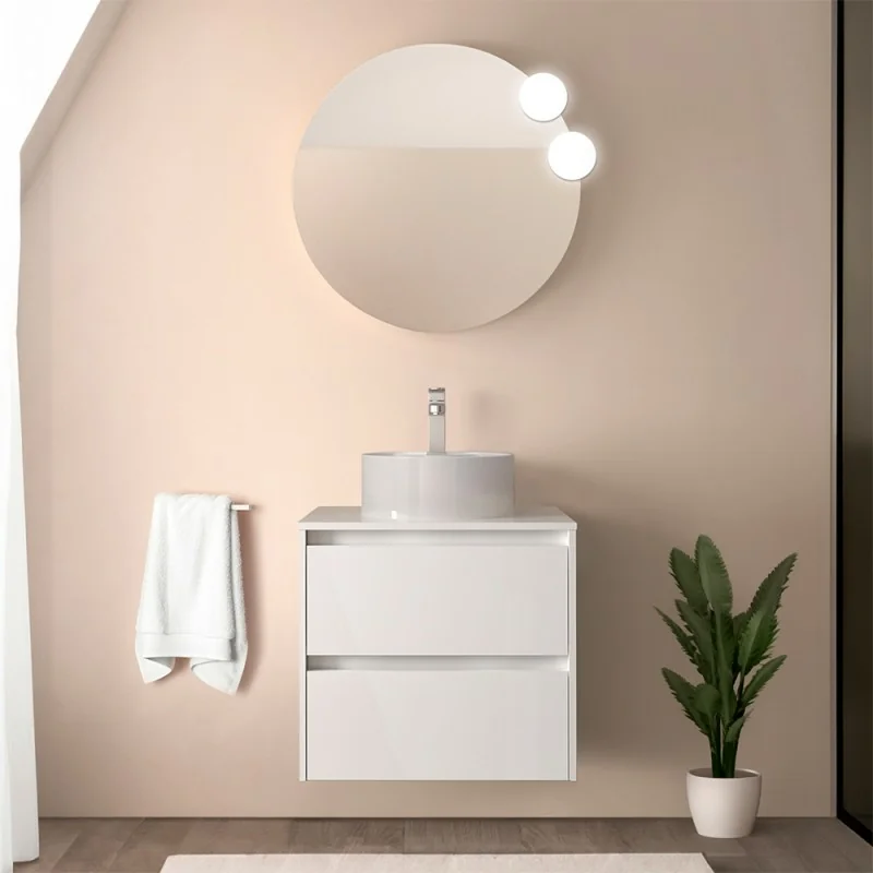 Mobile con top per lavabo d’appoggio,2 cassetti soft-close e specchio tondo a filo 60 cm