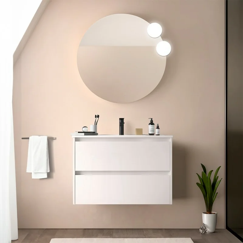 Set di mobile bagno con 2 cassetti soft-close,lavabo in ceramica e specchio tondo a filo 80 cm