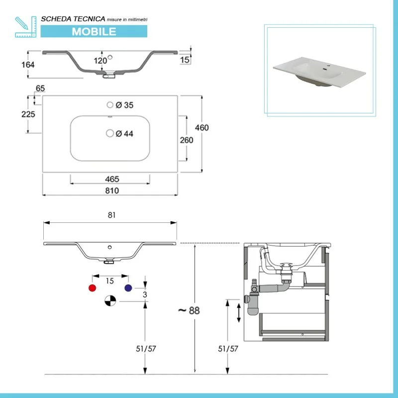 • Dimensioni lavabo: L 81 x p 46 x H 16,4 cm;