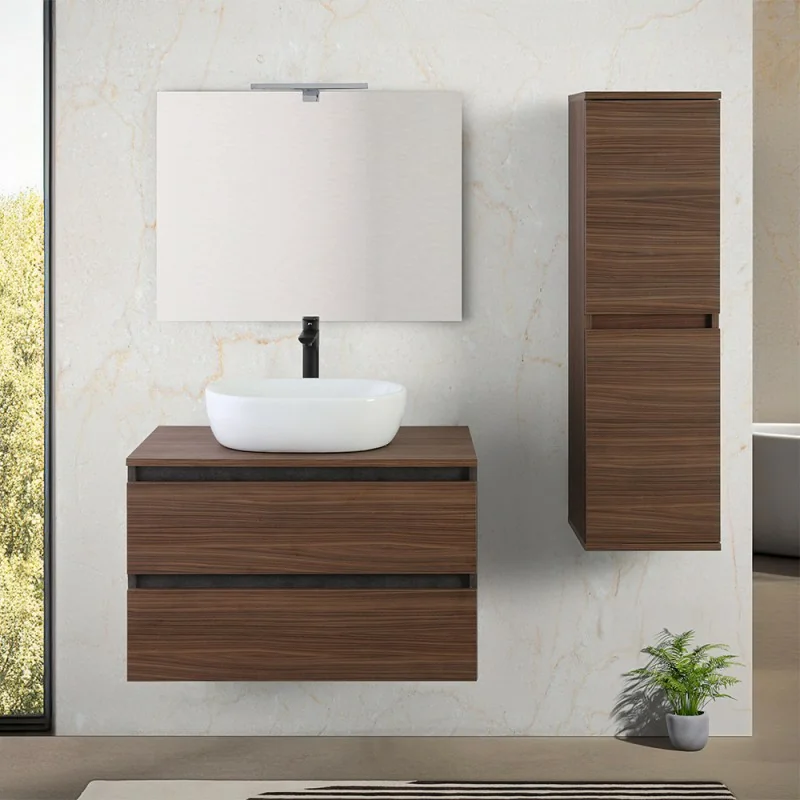 Mobile bagno sospeso 80 cm ossido e noce con top lavabo e specchio Kleo