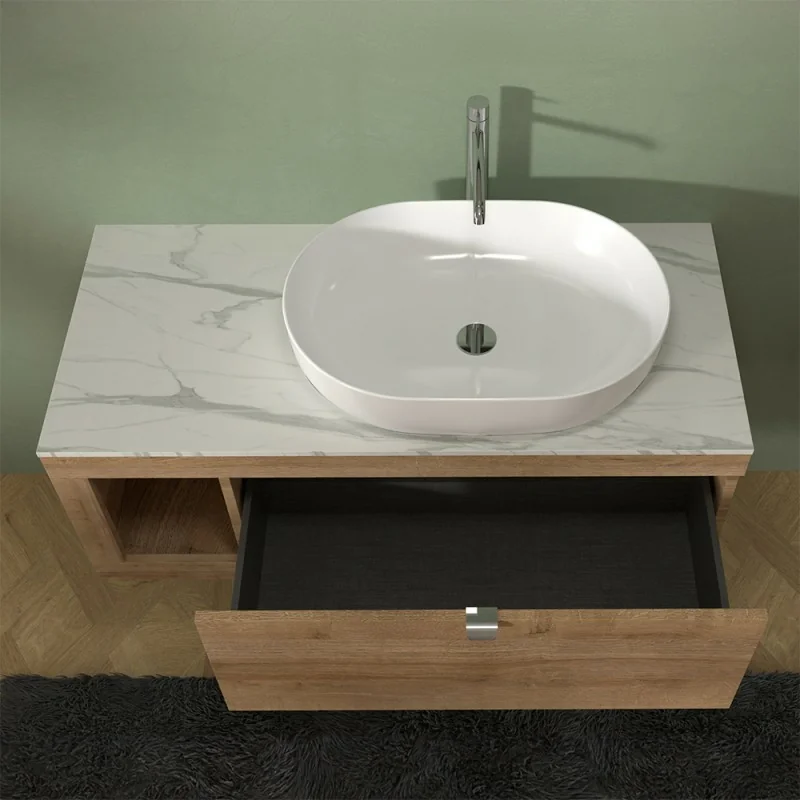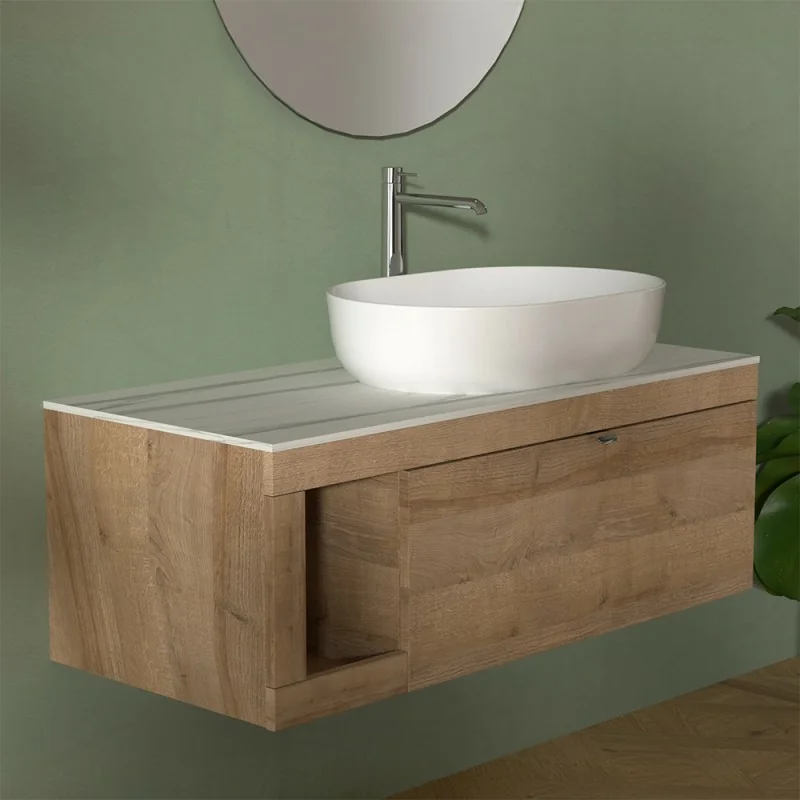 Base portalavabo sospesa con cassetto soft-close e vano laterale,specchio tondo 80 cm