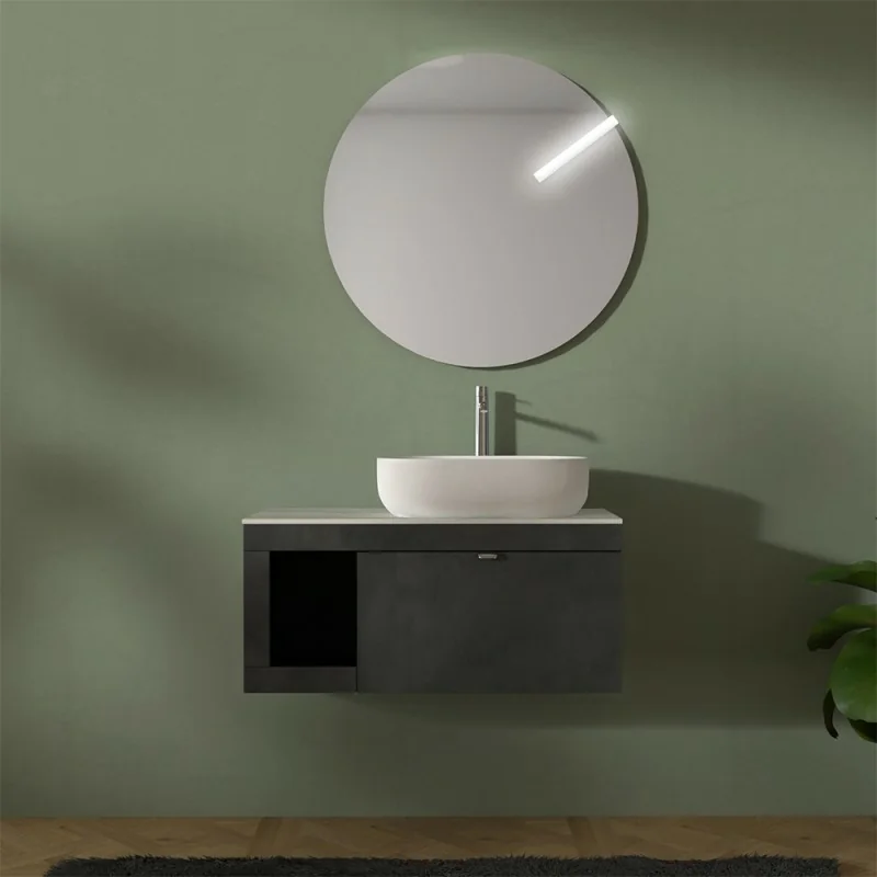 Base portalavabo sospesa con cassetto soft-close e vano laterale,specchio tondo 80 cm
