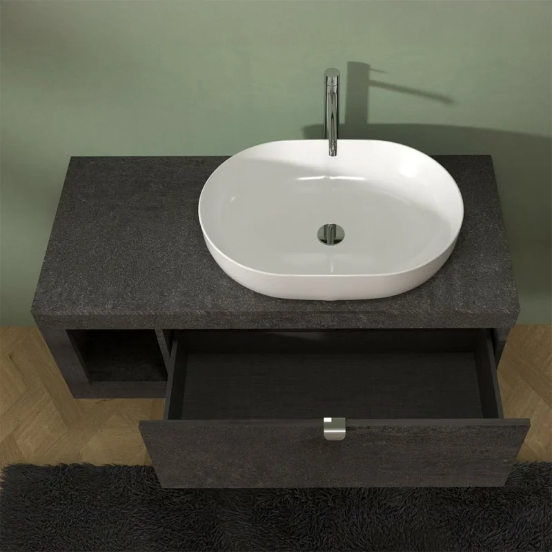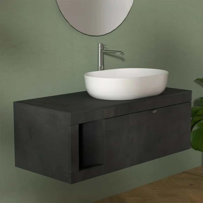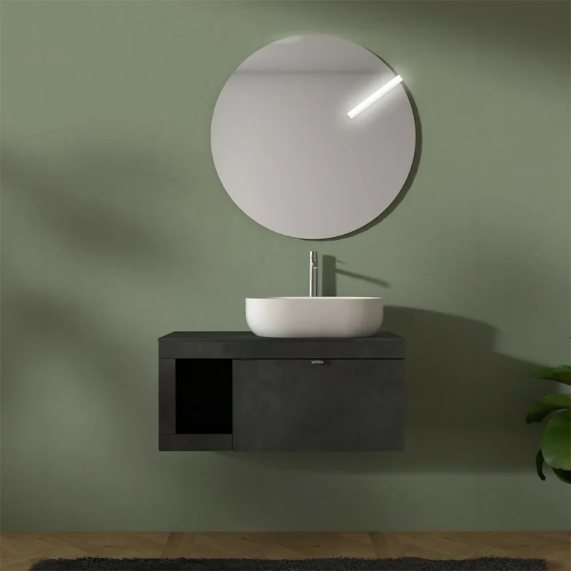 Base portalavabo sospesa con cassetto soft-close e vano laterale,specchio tondo 80 cm