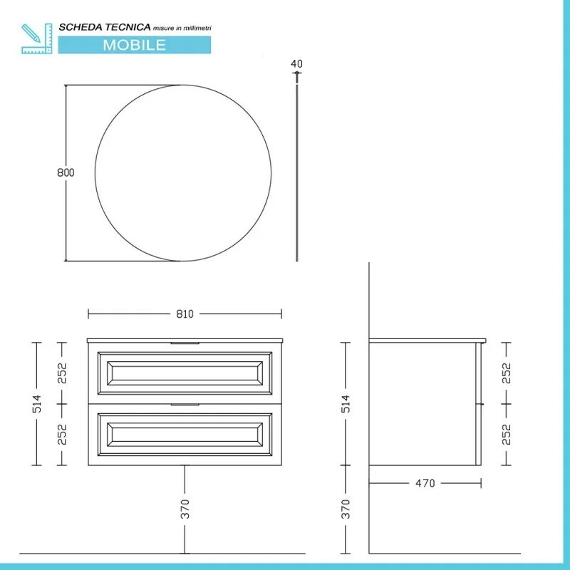 • Dimensioni specchio:Ø 80 cm,spessore 0,4 cm;