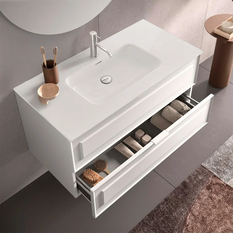 La base portalavabo dispone di 2 cassettoni soft-close regolabili in qualsiasi direzione e con apertura tramite maniglia in metallo. Matisse include lavabo in ceramica e specchio tondo a filo,un elemento in grado di garantire un’ampia superficie riflettente e dare al mobile bagno un tocco ancora più moderno.