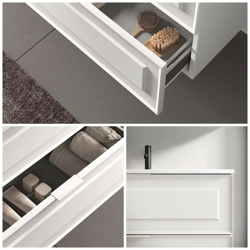 Matisse è l’arredo bagno che unisce la semplicità delle linee squadrate alla profondità del frontale bugnato:composizioni bagno sospese realizzate in legno MDF e personalizzabili con diverse finiture opache.