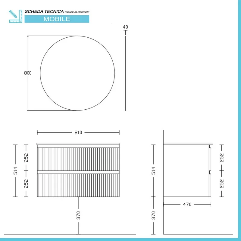 Mobile sottolavabo con due cassetti soft-close,vasca integrata in ceramica e specchio tondo 80 cm