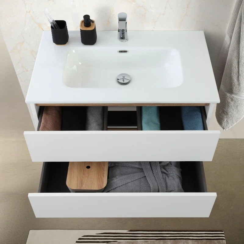 Mobile bagno sospeso 80 cm bianco e rovere con cassetti soft-close Kleo