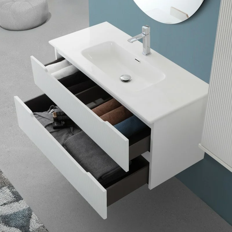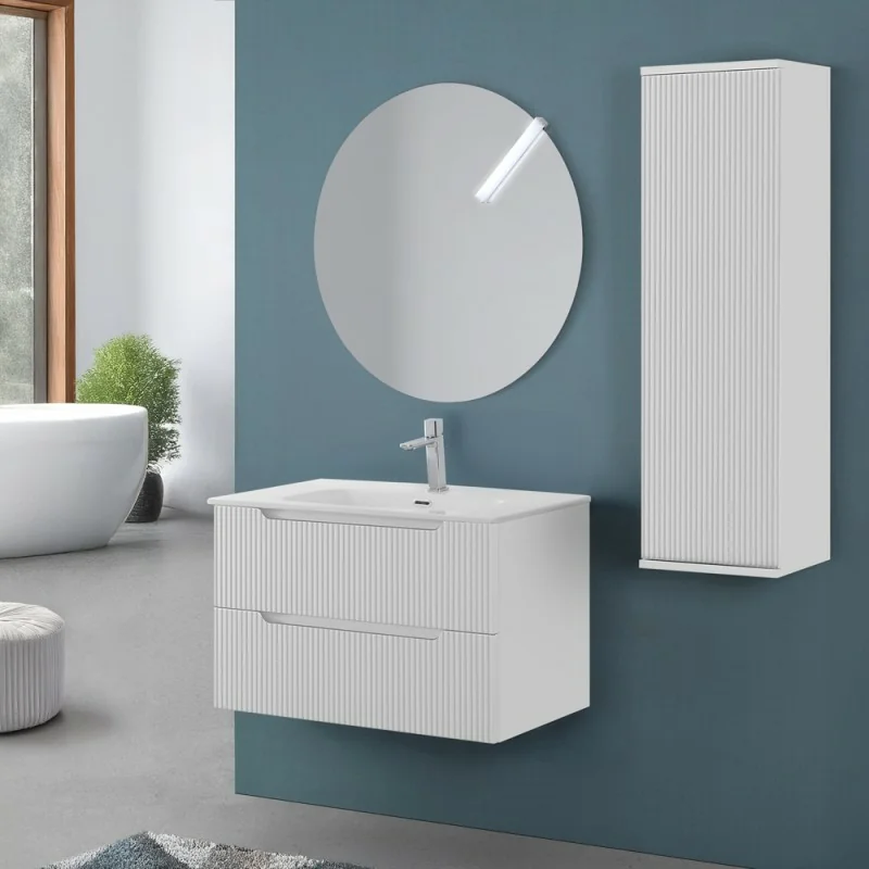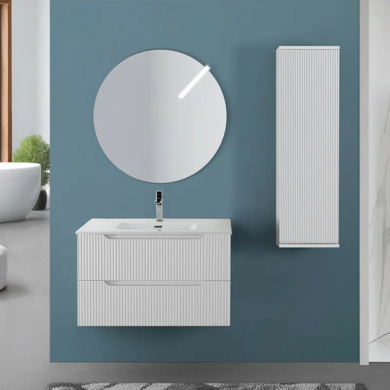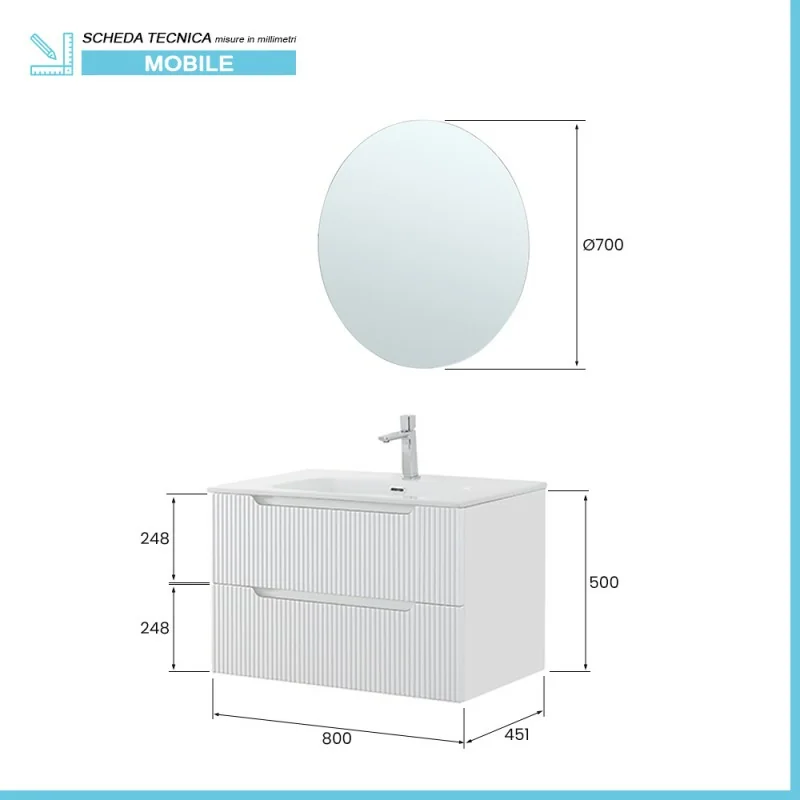 Mobile bagno sospeso 80 bianco cannettato doppi cassetto lavabo e specchio Wise