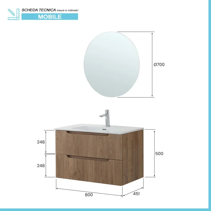Mobile bagno sospeso 80 rovere cannettato doppi cassetto lavabo e specchio Wise
