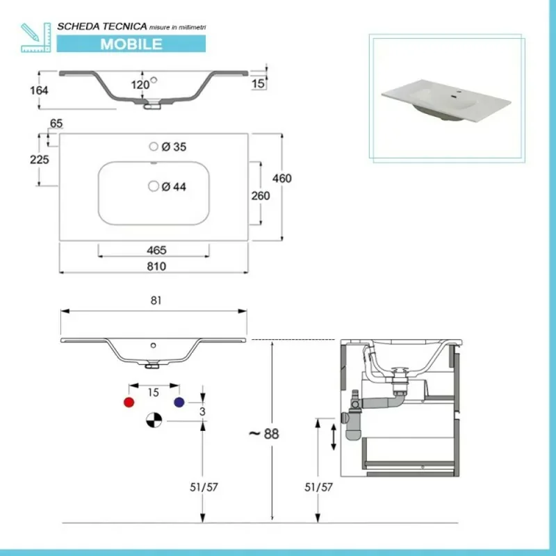 • Dimensioni lavabo: 81x46x16,4 cm;