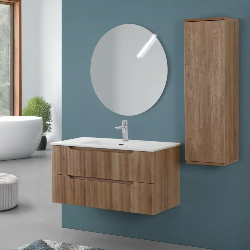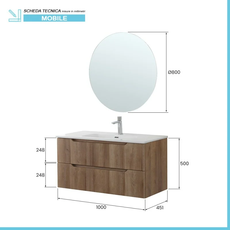 Mobile bagno sospeso 100 rovere cannettato doppi cassetto lavabo e specchio Wise
