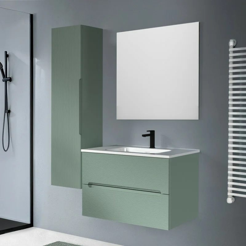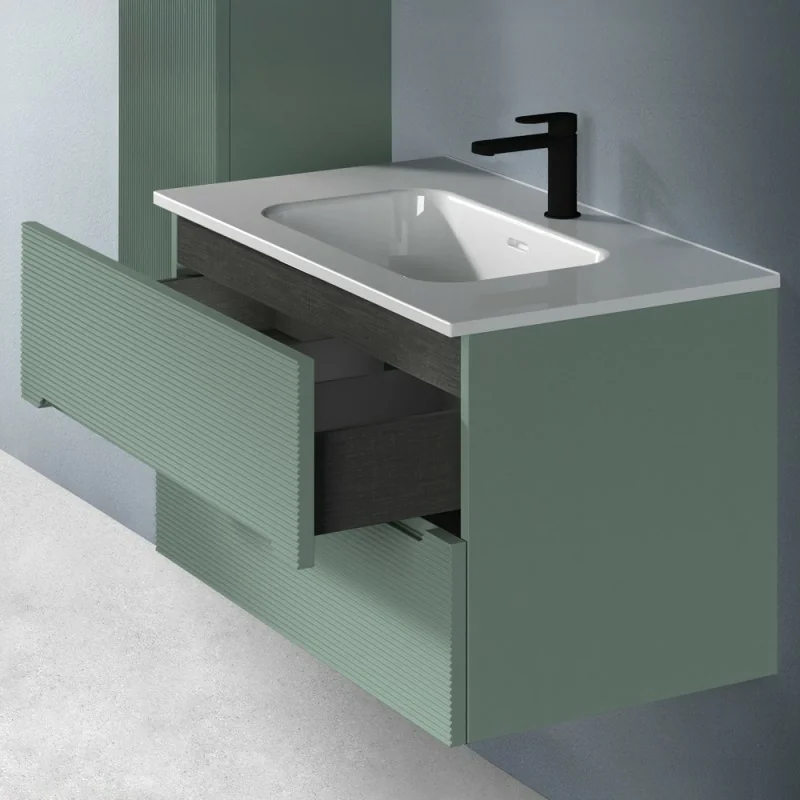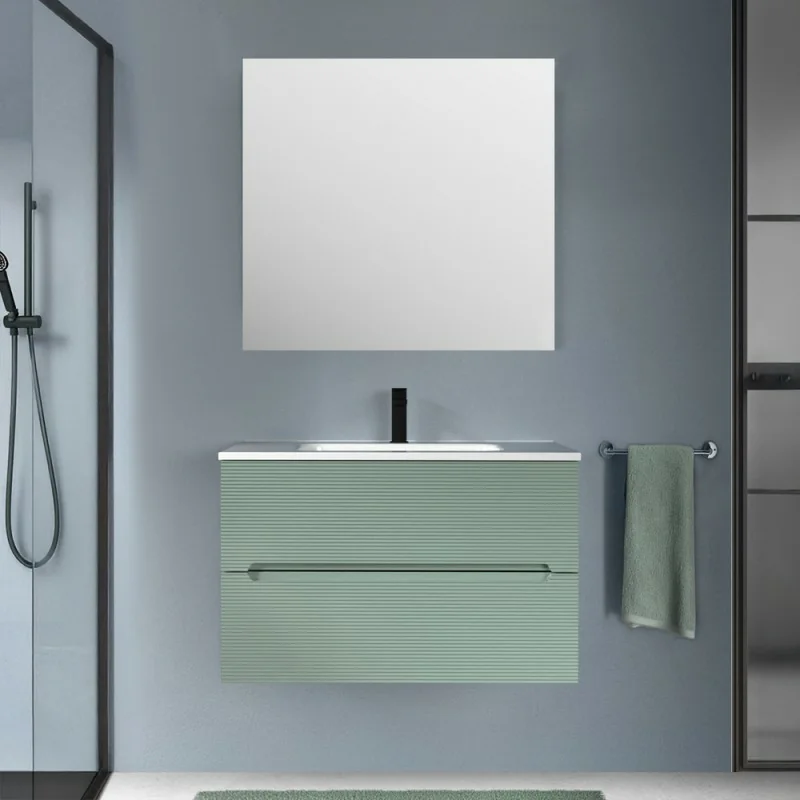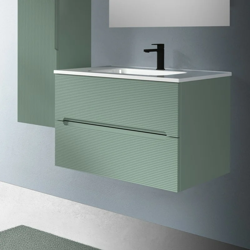 Mobile bagno sospeso 80 verde cannettato 2 cassetti lavabo e specchio Rigo