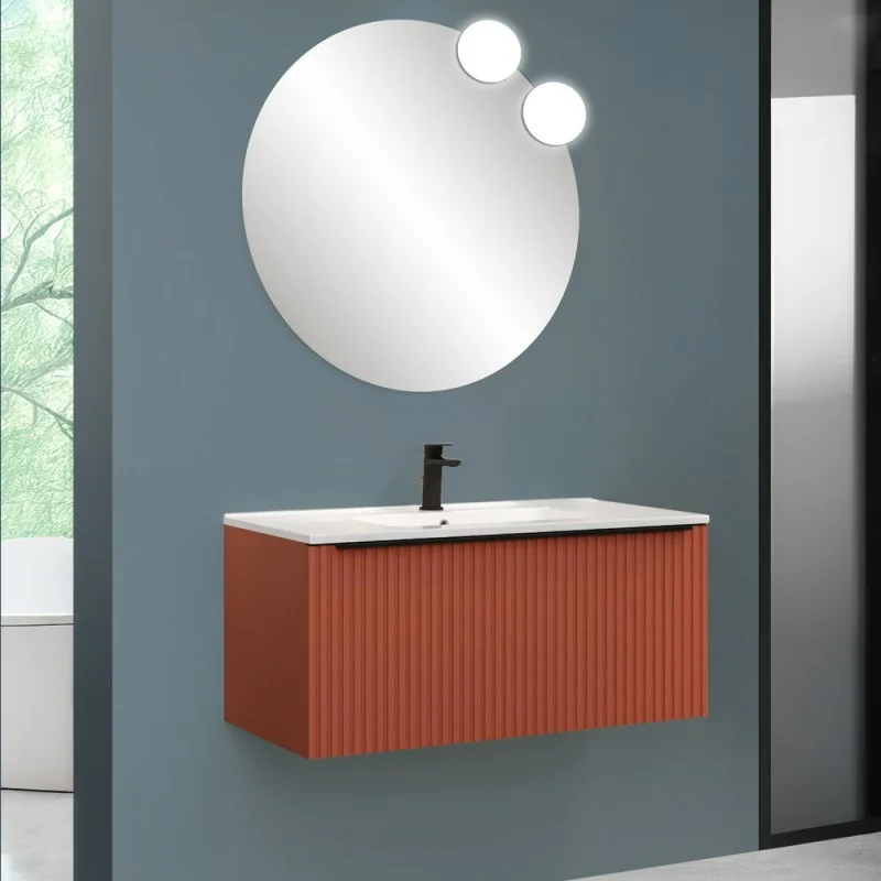 Questo mobile bagno sospeso da 90 cm in finitura terracotta cannettato coniuga eleganza e funzionalità in un design compatto e raffinato. Il cassetto con maniglia nera opaca e chiusura rallentata garantisce praticità e ordine quotidiano, mentre il lavabo in ceramica e lo specchio tondo completano la composizione con equilibrio e stile, per un ambiente bagno armonioso e accogliente.
