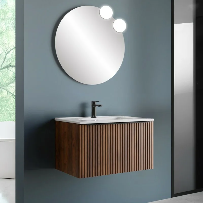 Mobile da bagno sospeso 70 cm color noce maya cannettato con cassetto e maniglia a chiusura rallentata, specchio tondo da ⌀70 cm e lavabo in ceramica Nara