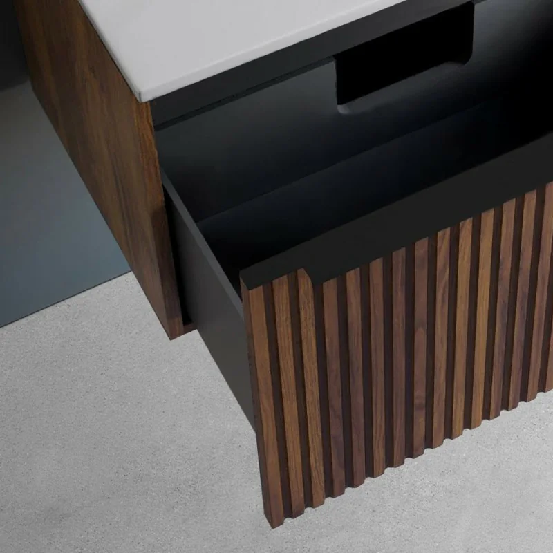 Mobile bagno sospeso 70 cm Noce Maya cannettato con cassetto, specchio e lavabo Nara