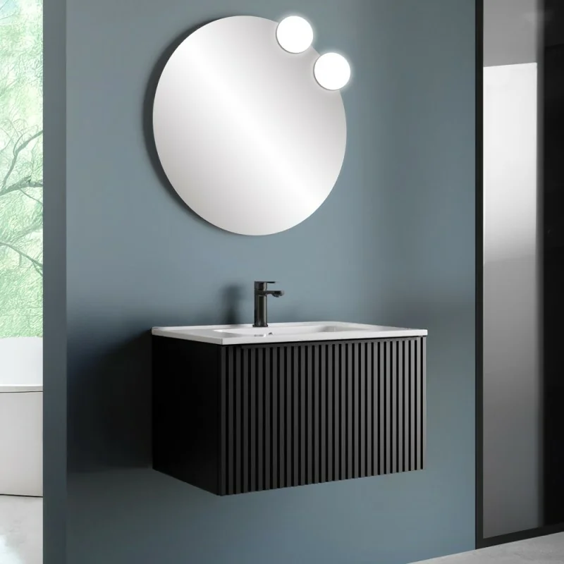 Mobile da bagno sospeso 70 cm color nero opaco cannettato con cassetto e maniglia a chiusura rallentata, specchio tondo da ⌀70 cm e lavabo in ceramica Nara