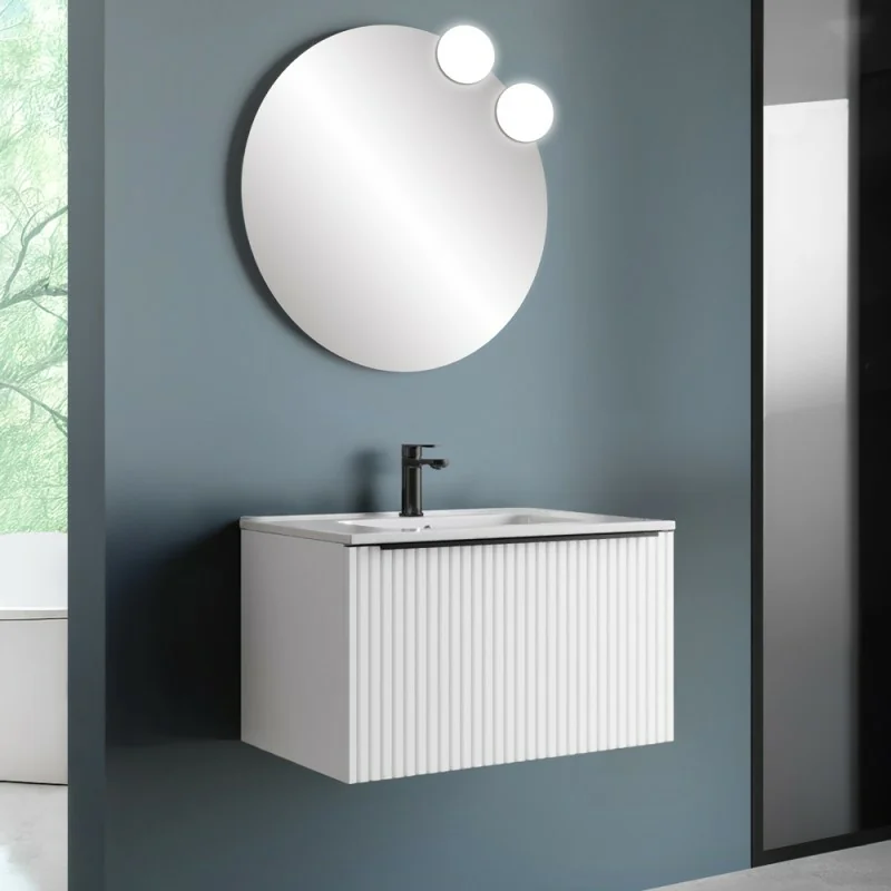 Mobile da bagno sospeso 80 cm color bianco opaco cannettato con cassetto con maniglia a chiusura rallentata, specchio tondo da ⌀80 cm e lavabo in ceramica Nara