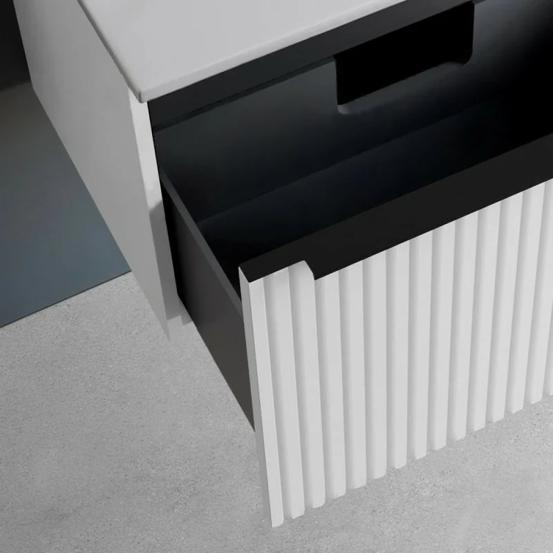 Questo mobile bagno sospeso da 80 cm in finitura bianco opaco cannettato coniuga eleganza e funzionalità in un design compatto e raffinato. Il cassetto con maniglia nera opaca e chiusura rallentata garantisce praticità, sicurezza e ordine quotidiano, mentre il lavabo in ceramica e lo specchio tondo completano la composizione con equilibrio e stile, per un ambiente bagno armonioso e accogliente.