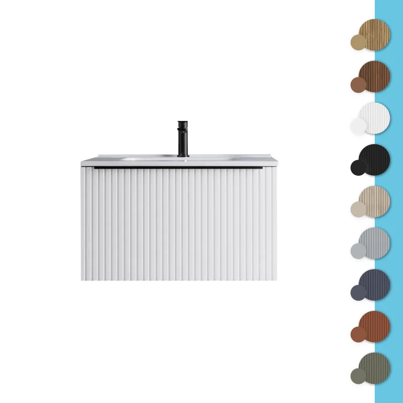 Mobile bagno sospeso 80 cm bianco opaco cannettato con cassetto, specchio e lavabo Nara