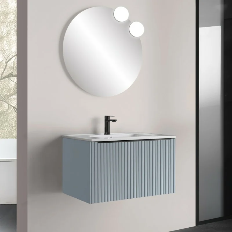 Questo mobile bagno sospeso da 80 cm in finitura azzurro polvere opaco cannettato coniuga eleganza e funzionalità in un design compatto e raffinato. Il cassetto con maniglia nera opaca e chiusura rallentata garantisce praticità, sicurezza e ordine quotidiano, mentre il lavabo in ceramica e lo specchio tondo completano la composizione con equilibrio e stile, per un ambiente bagno armonioso e accogliente.