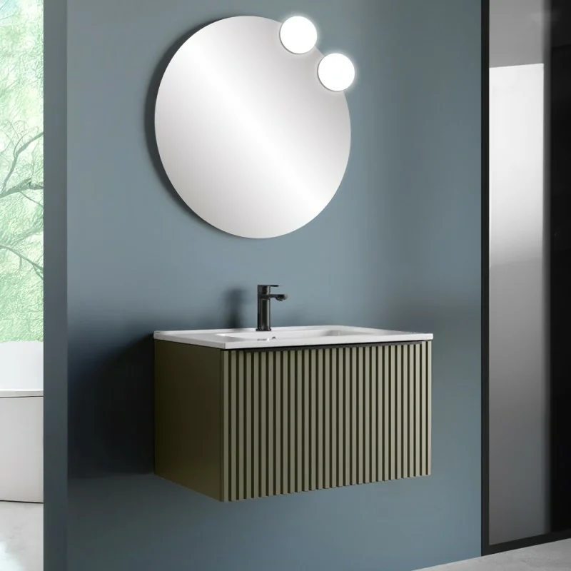 Mobile da bagno sospeso 80 cm color verde opaco cannettato con cassetto e maniglia a chiusura rallentata, specchio tondo da ⌀80 cm e lavabo in ceramica Nara
