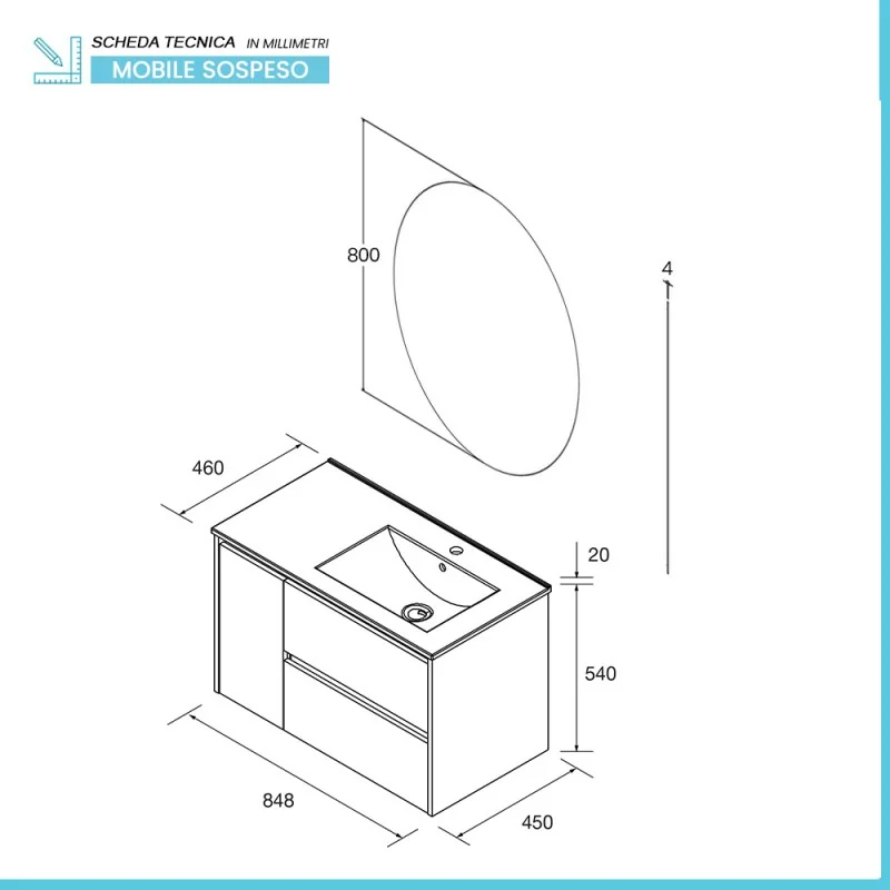 Mobile sospeso bagno 85 cm con lavabo 2 cassetti 1 anta e specchio inclusi linea Gaya