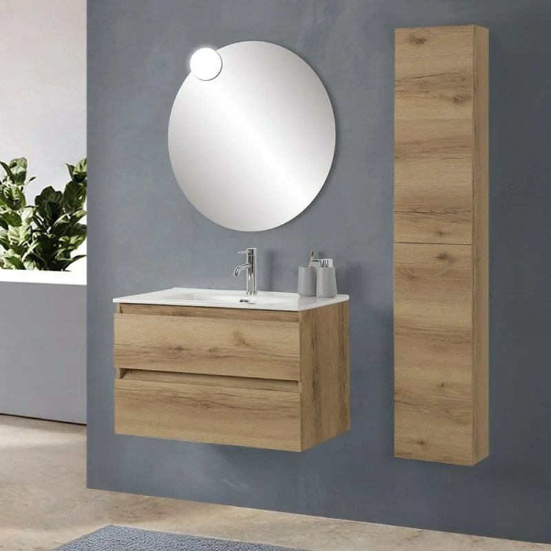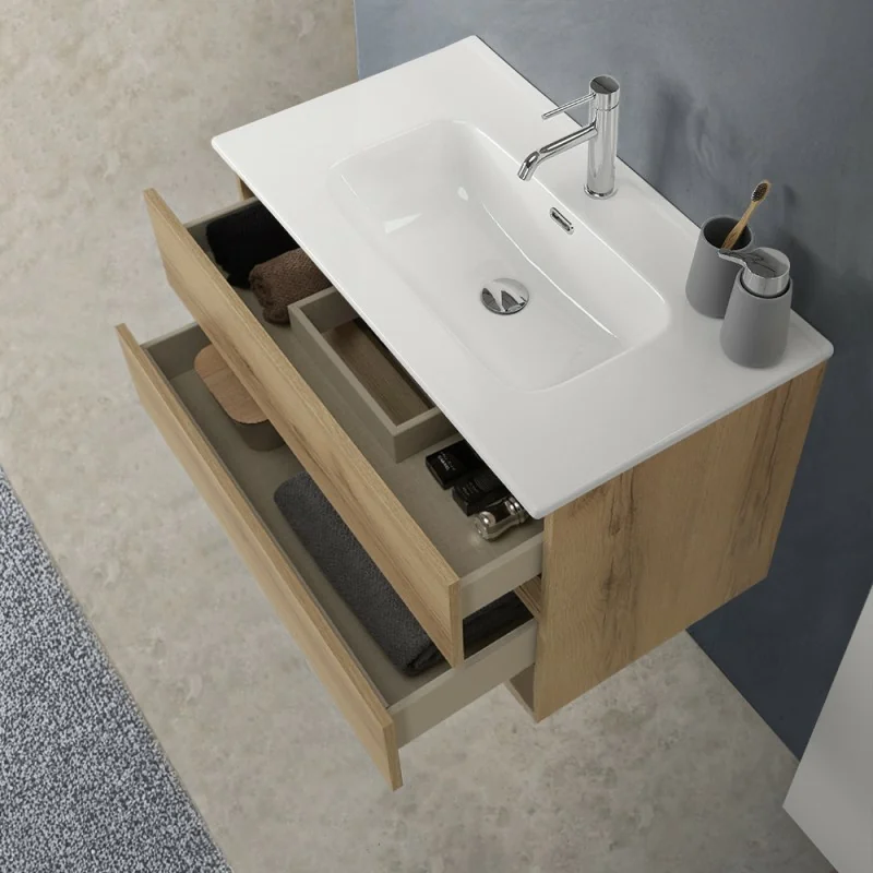 Mobile bagno 80 cm sospeso in legno nobilitato color quercia naturale chiusura soft-close 2 cassettoni con lavabo e specchio inclusi Leda