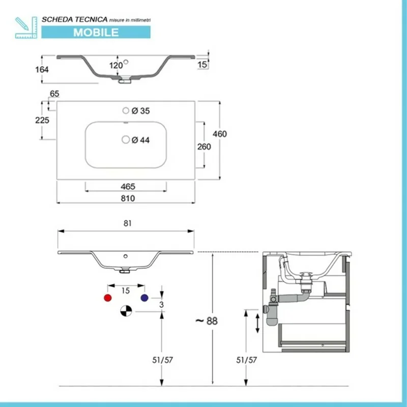 • Dimensioni lavabo: H 16,4 x P 46 x L 81 cm;