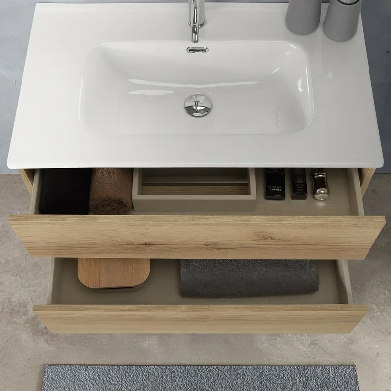 Mobile bagno 80 cm sospeso in legno nobilitato color quercia naturale chiusura soft-close 2 cassettoni con lavabo e specchio inclusi Leda   Il...