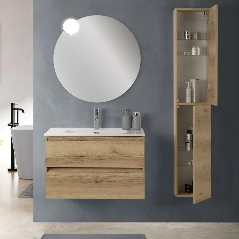 Mobile bagno sospeso 80 cm in legno color quercia naturale chiusura soft-close con lavabo e specchio inclusi Leda
