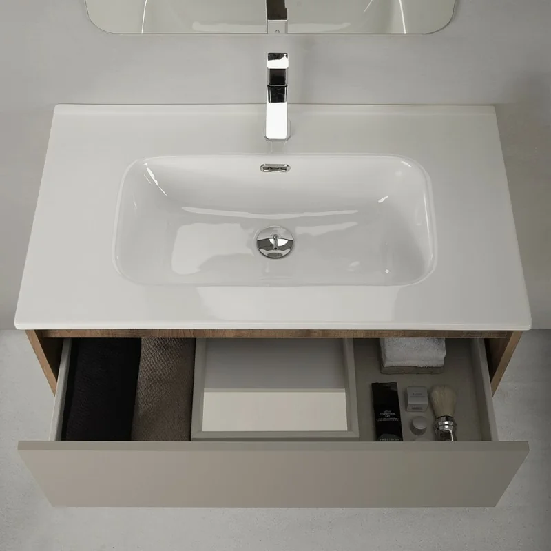 Questo mobile da bagno sospeso ha un ampio vano contenitore dotato di apertura a gola e sistema soft-close per evitare urti. È presente un lavabo in ceramica ad incasso con foro miscelatore centrato. Completa la composizione uno specchio a filo lucido con angoli arrotondati.
